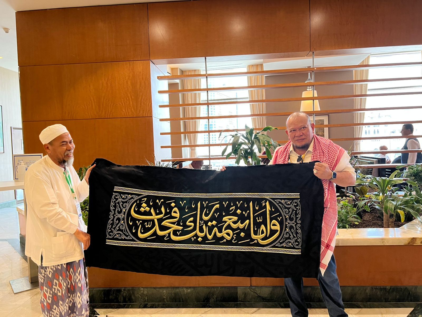 SINARGUNUNG.COM, MAKKAH | KH Muhammad Najih Maimoen, yang biasa disapa Gus Najih Maimoen, putra kedua almarhum KH Maimoen Zubair memberikan kaligrafi yang bertuliskan Ayat 11 Surat Ad-Dhuha kepada Ketua DPD RI AA LaNyalla Mahmud Mattalitti saat keduanya bertemu di Makkah, Rabu (13/7/2022) siang waktu setempat.