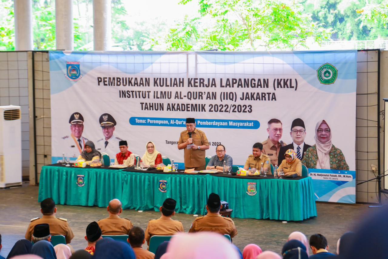 SINARGUNUNG.COM, TANGSEL | Wali Kota Tangerang Selatan, Benyamin Davnie berpesan kepada seluruh peserta Institut Ilmu Al-Qur’an (IIQ) Jakarta yang mengikuti Kuliah Kerja Lapangan (KKL) untuk mampu mengetahui gambaran umum dan cara bekerja di lingkungan Kota Tangsel. Apalagi Tangsel sebagai kota dengan pertumbuhan penduduk dan ekonomi yang terus meningkat. “Setidaknya perlu tau gambaran umum Tangsel, jadi pas turun ke lapangan udah ga kaget lagi,” ucap Benyamin saat membuka KKL IIQ Jakarta di Gelanggang Seni dan Budaya Amphi Theater, Setu, Senin (10/07).