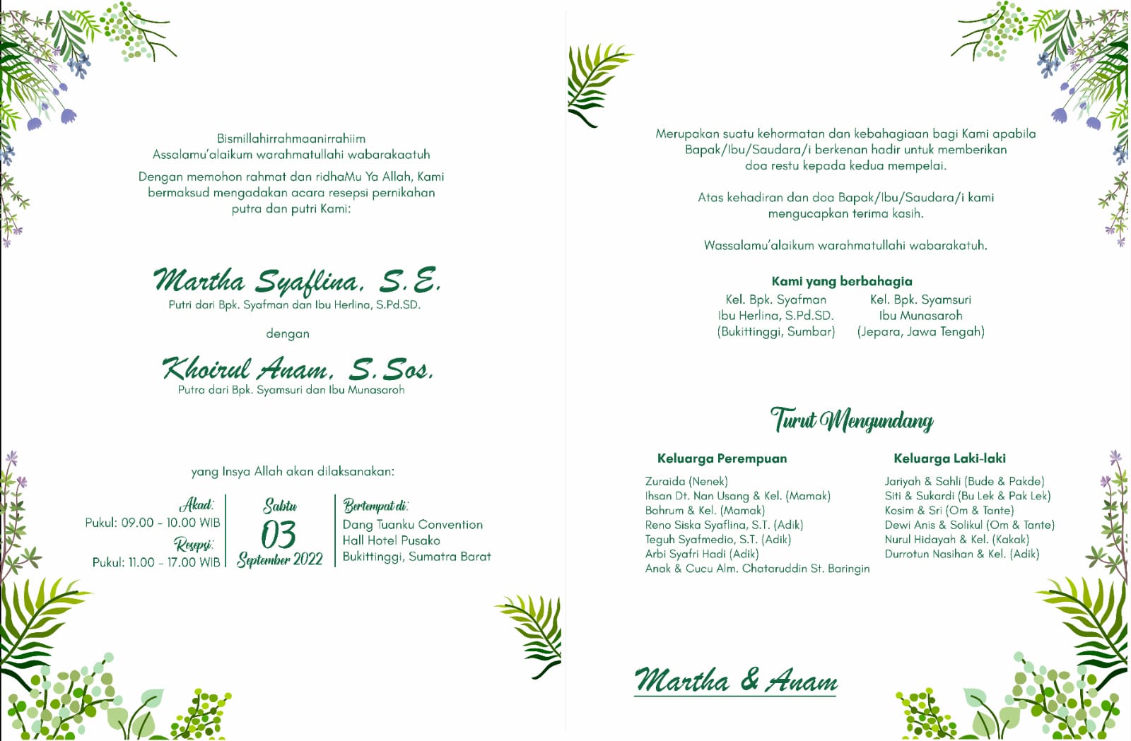 SINARGUNUNG. COM, BUKITTINGGI | Direktur Utama PT Mediatama Zeine Kutuby (PT MZK) sekaligus Pimpinan Redaksi MZK News Martha Syaflina, S.E. akan mengakhiri masa lajangnya pada Sabtu, 3 September 2022. Martha dilamar dan akan dinikahi oleh seorang redaktur bernama Khoirul Anam, S.Sos. keturunan Jawa. Acara pernikahan tersebut akan dilaksanakan di Hotel Pusako Bukittinggi.