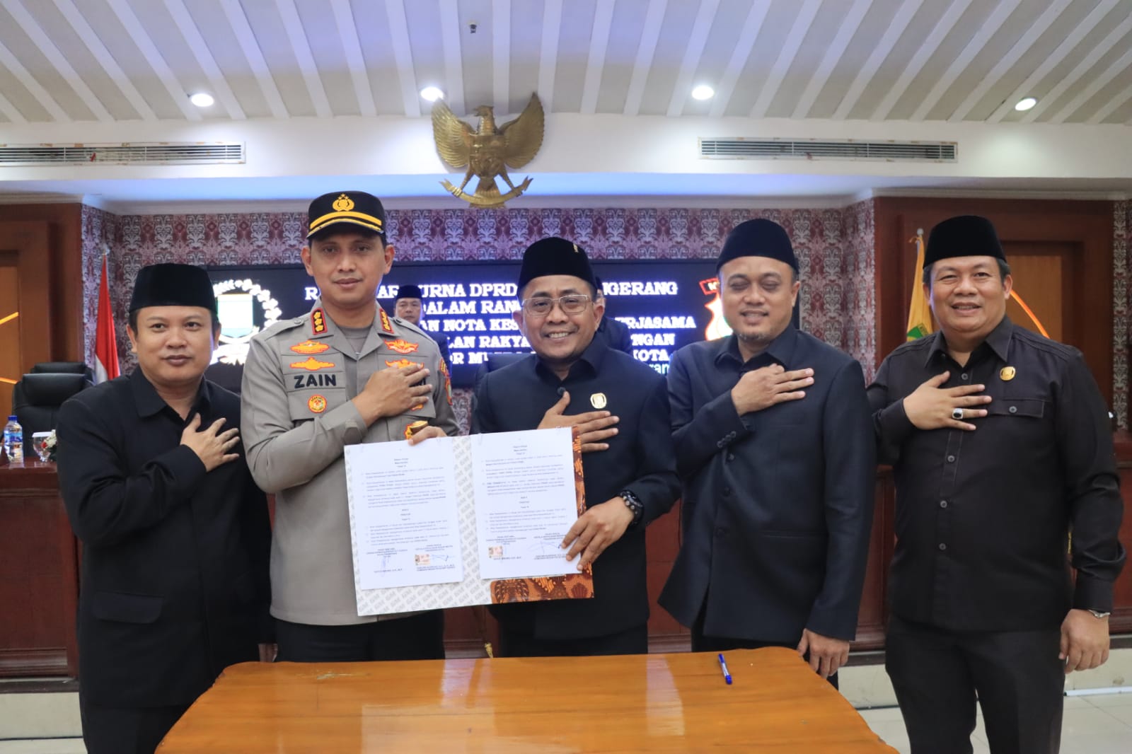 SINARGUNUNG.COM, KOTA TANGERANG | Kapolres Metro Tangerang Kota, Kombes Pol Zain Dwi Nugroho menghadiri rapat paripurna DPRD Kota Tangerang dalam rangka penandatanganan nota kesepakatan kerjasama antara DPRD Kota Tangerang dengan Polres Metro Tangerang Kota, Selasa (18/7/2023).