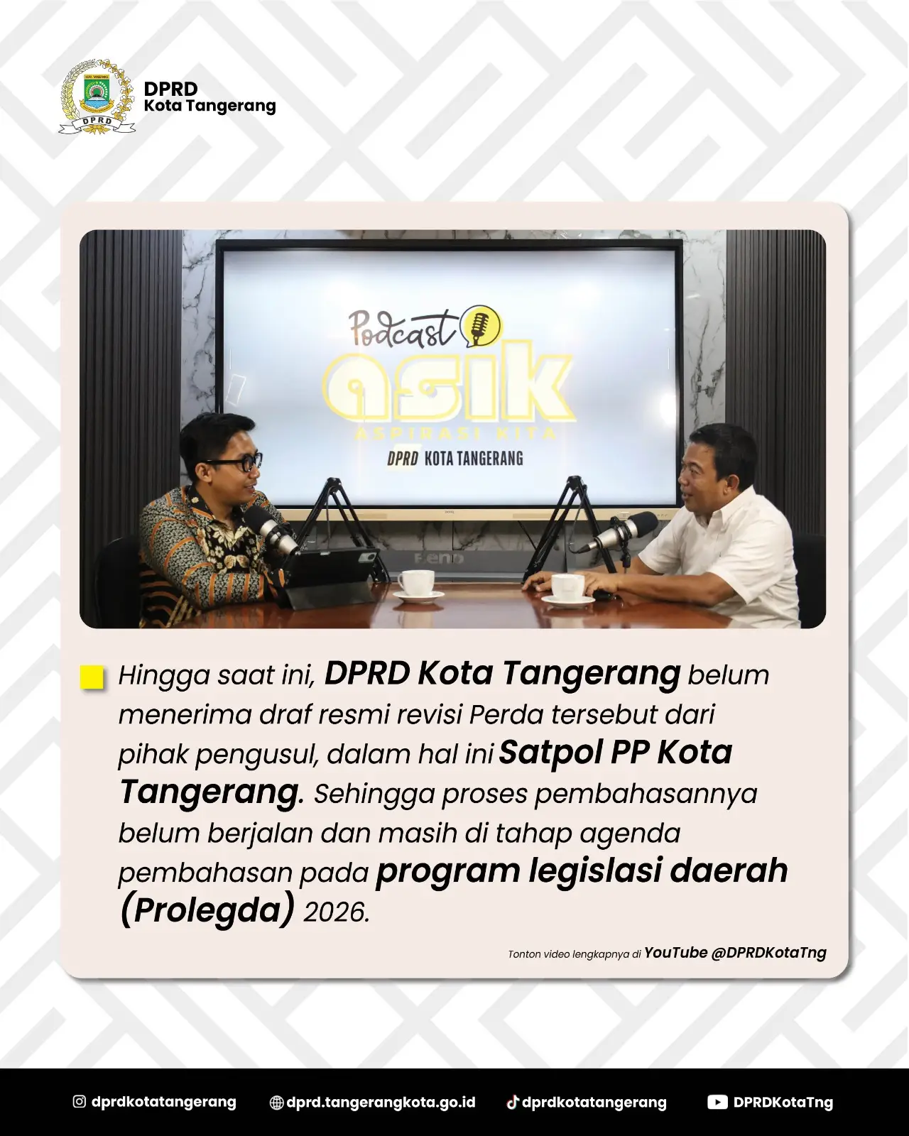 Rusdi menjelaskan, hingga saat ini DPRD Kota Tangerang belum menerima draf resmi usulan revisi Perda Nomor 7 dan 8 dari pihak pengusul, yakni Satpol PP Kota Tangerang. Dengan demikian, proses pembahasan belum dimulai dan masih sebatas masuk dalam Program Legislasi Daerah (Prolegda) Tahun 2026.
