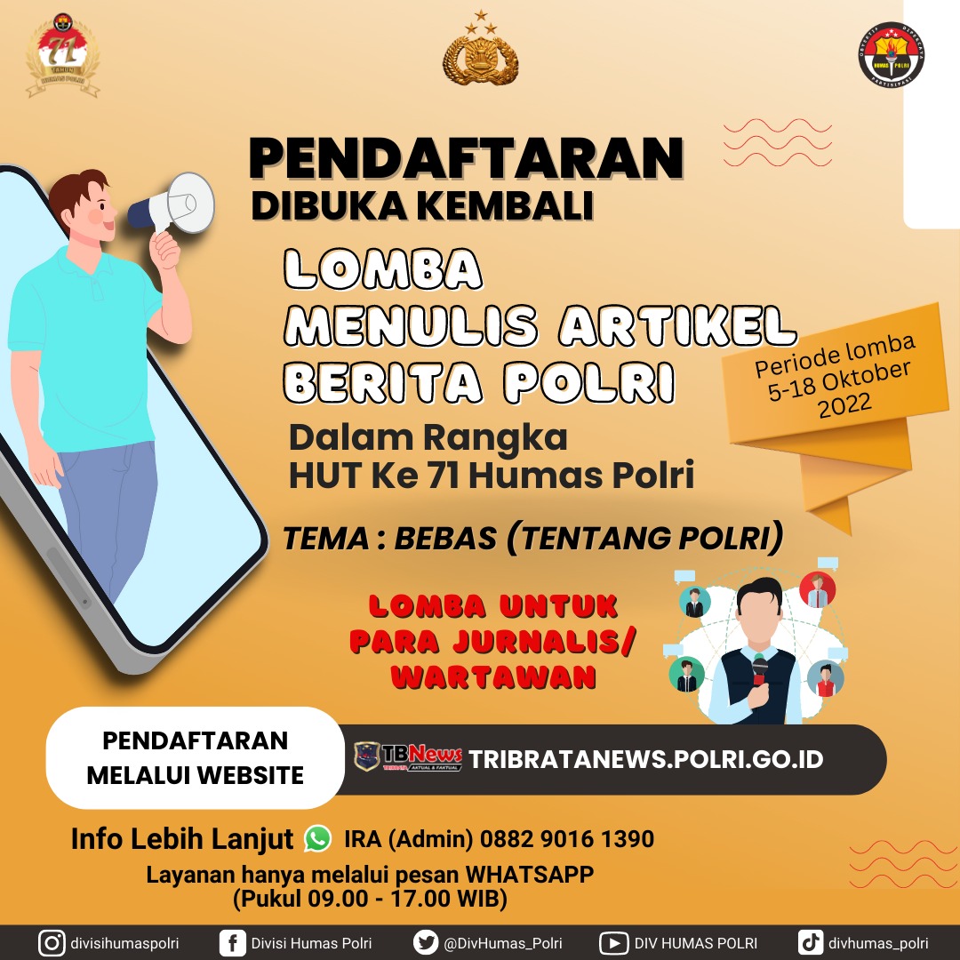 SINARGUNUNG.COM, BANTEN | Dalam rangka Hari Ulang Tahun ke-71 Humas Polri, Divisi Humas Polri membuka kembali pendaftaran Lomba Menulis Artikel Berita Polri 2022 untuk para sahabat Jurnalis atau Wartawan yang akan berlangsung sampai 18 Oktober 2022 dengan tema Bebas tentang Polri.