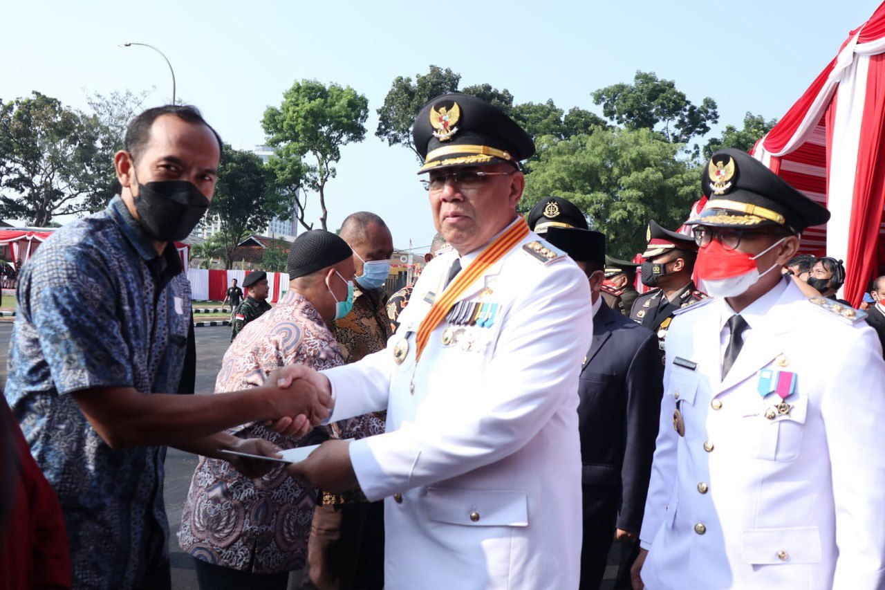 SINARGUNUNG.COM, TANGSEL | Wali Kota Benyamin Davnie menyerahkan secara simbolis sertipikat tanah kepada warga. Penyerahan sertipikat tersebut saat pelaksanaan upacara pengibaran bendera merah putih di lapangan Cilenggang, Serpong. Rabu (17/8).