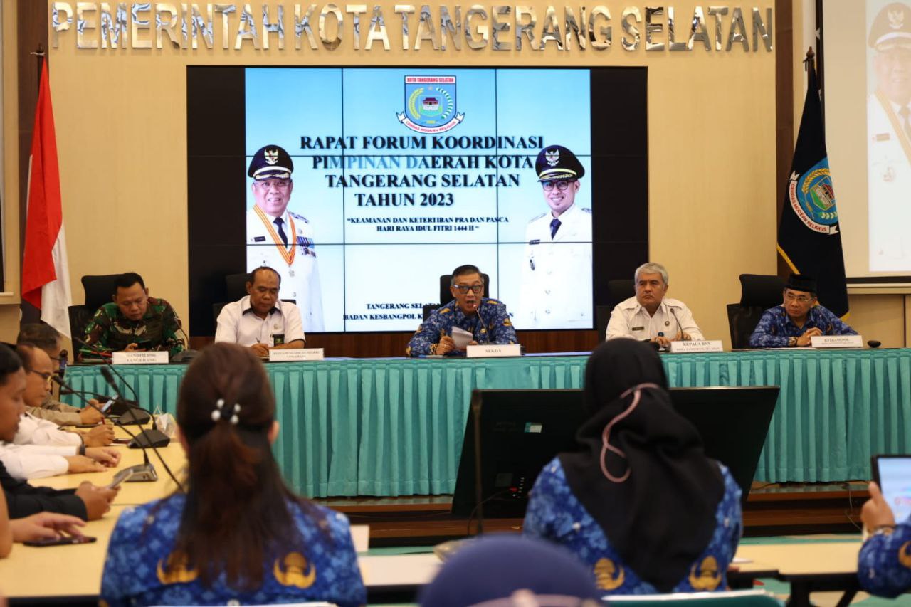 SINARGUNUNG.COM, TANGSEL | Persiapan dalam menyambut Idulfitri 1444 H terus dilakukan Pemerintah Kota Tangerang Selatan. Mulai dari kesiapan posko mudik, Dinas Pemadam Kebakaran dan Penyelamatan, hingga koordinasi dengan tingkat kewilayahan RT dan RW. Hal itu disampaikan oleh Sekretaris Daerah Kota Tangerang Selatan Bambang Noertjahjo yang memimpin rapat Forum Koordinasi Pimpinan Daerah mengenai keamanan serta ketertiban sebelum dan sesudah Idulfitri. Kegiatan tersebut diselenggarakan di Ruang Blandongan, Puspemkot Tangsel, Senin (16/04).