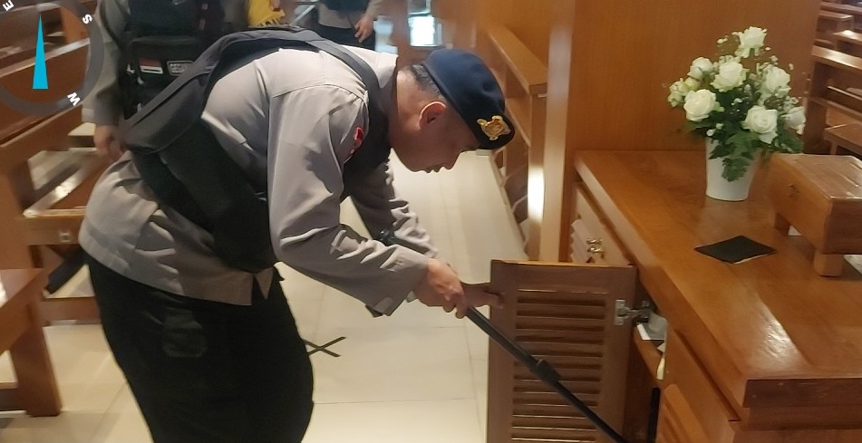 Petugas gabungan yang terdiri dari kepolisian, TNI, dan pengurus gereja melakukan penyisiran menyeluruh di area vital. Mulai dari altar, ruang ibadah, ruang kontrol CCTV, hingga area parkir diperiksa secara detail guna mengantisipasi potensi gangguan keamanan.