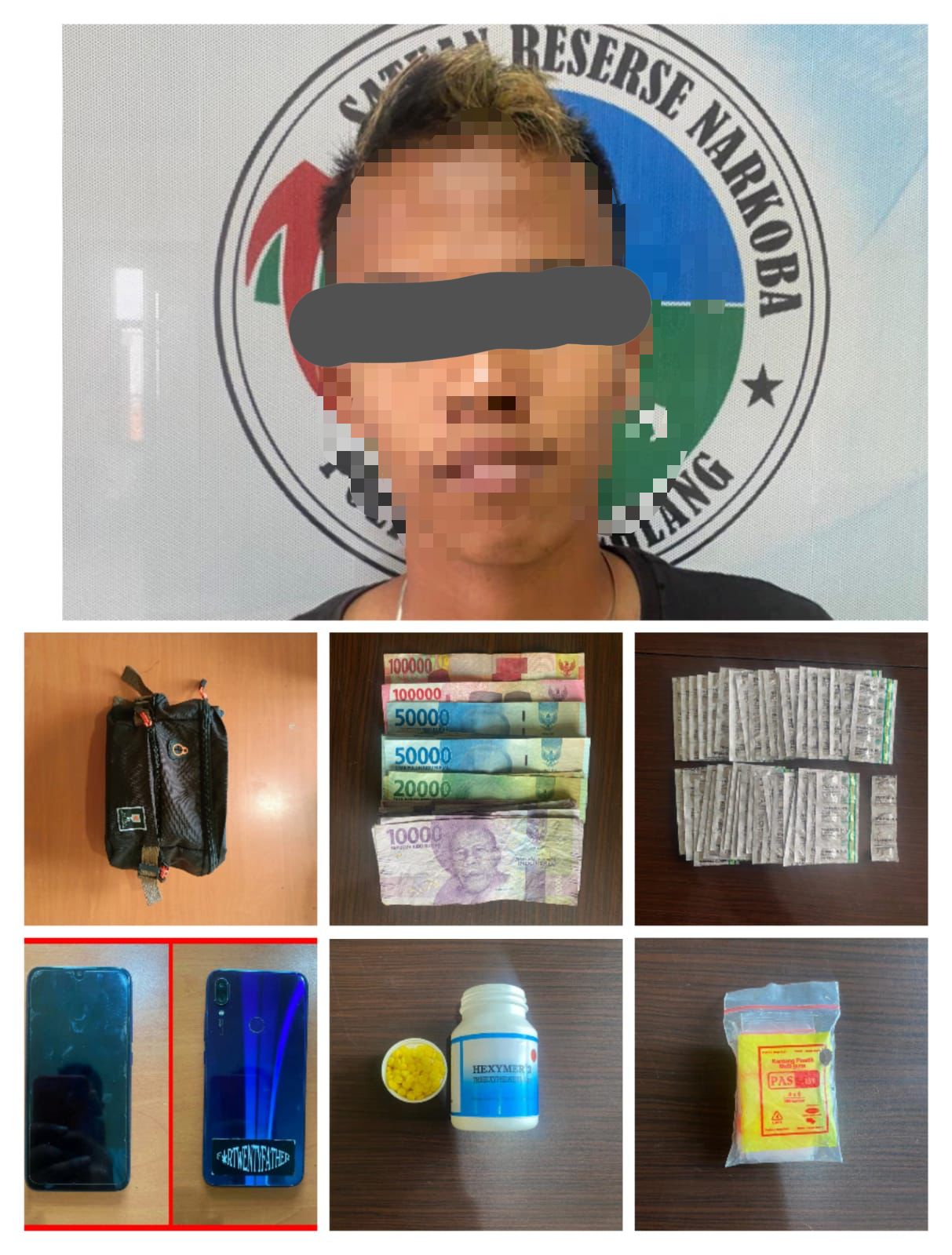 “Barang bukti yang kita sita sebanyak 405 butir obat merk tablet TRAMADOL HCI, 1 pot yang berisikan 402 butir obat tablet warna kuning berlogo MF (Hexymer), 1 buah HP merk Redmi warna biru, 1 buah tas pinggang berwarna hitam,” ucapnya.