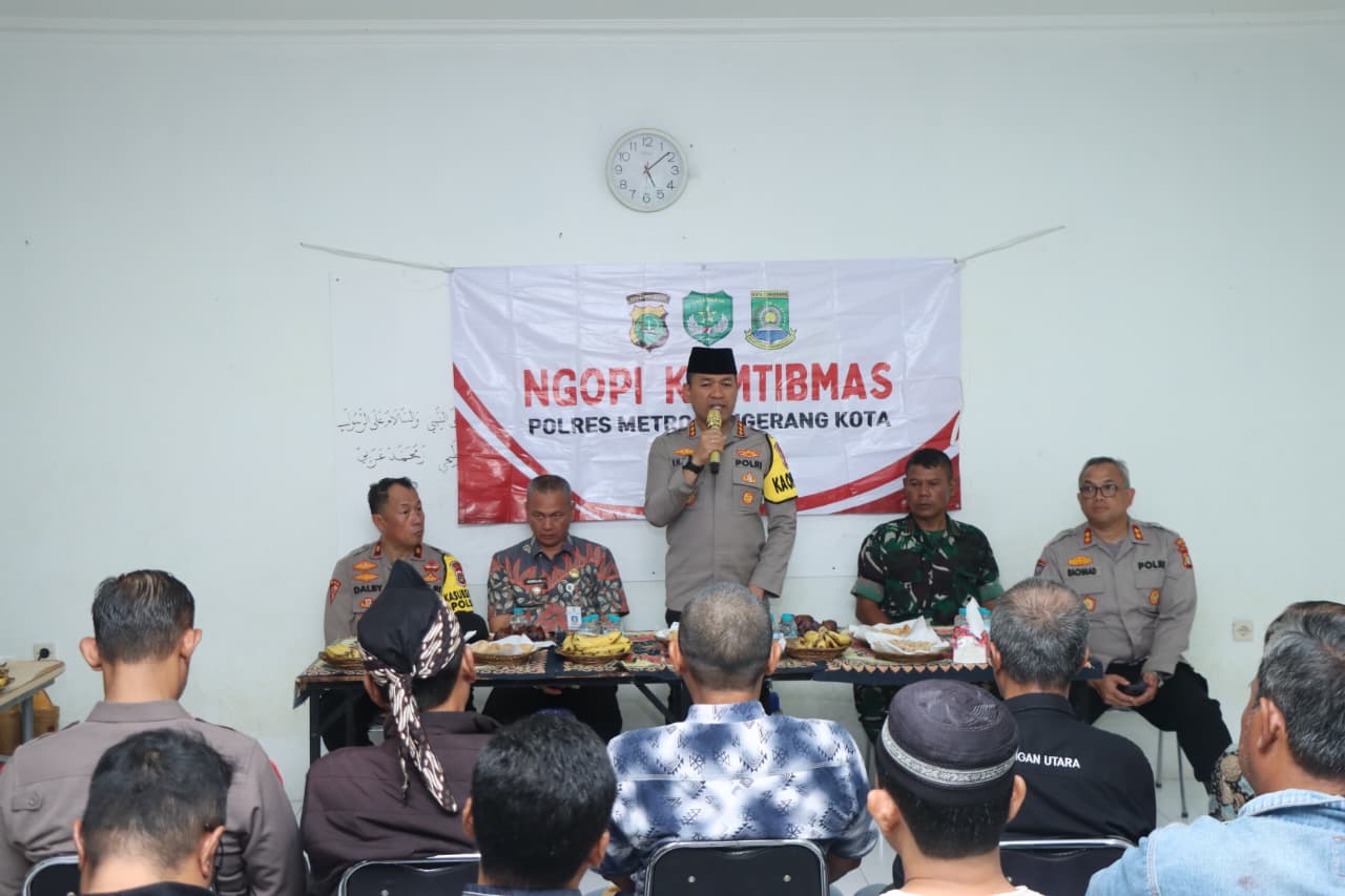 sinargunung.com, Kota Tangerang | Kapolres Metro Tangerang Kota, Kombes Pol Dr. Raden Muhammad Jauhari, S.H., S.I.K., M.Si., bersama jajaran Pejabat Utama (PJU) Polres menggelar kegiatan Ngopi Kamtibmas bersama warga Kelurahan Larangan Utara, Kecamatan Larangan, Kota Tangerang, Kamis (30/10/2025) sore.