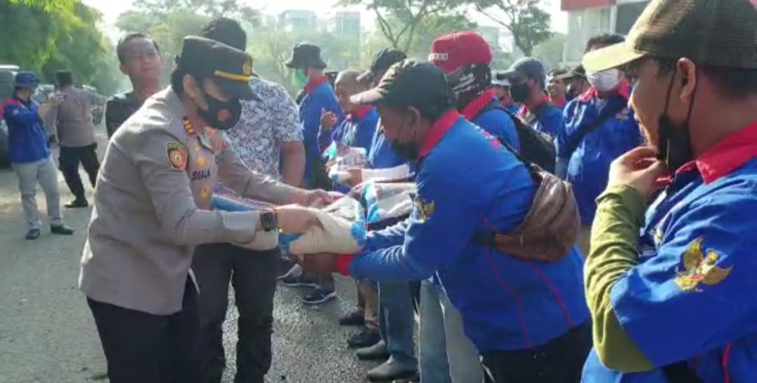 SINARGUNG.COM, TANGSEL | Kapolsek Pagedangan secara langsung menggelar bantuan sosial (Bansos) sembako terutama bagi warga yang kurang mampu yang terdampak dari penyesuaian kenaikan bbm, kali ini pembagian bansos sembako tersebut diberikan kepada Buruh dari serikat SPSI PT. Indorama Ventures yang berada di wilayah hukum Polsek Pagedangan yang hendak menuju jakarta untuk melakukan unras.