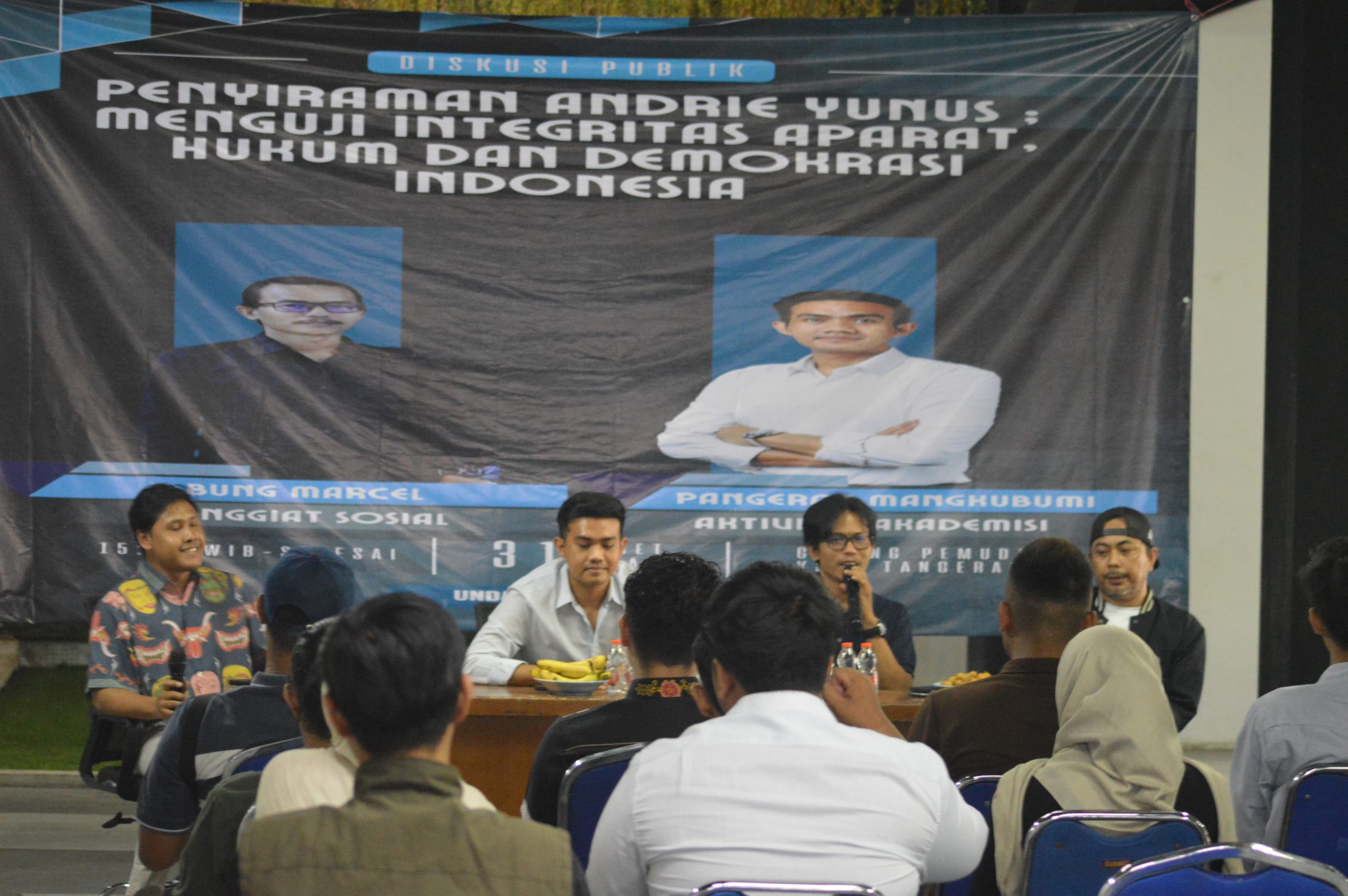 Sorotan tersebut menguat dalam diskusi publik bertajuk “Penyiraman Andry Yunus, Menguji Integritas Aparat, Hukum, dan Demokrasi Indonesia” yang digelar di Gedung KNPI Kota Tangerang, Selasa (31/3/2026).