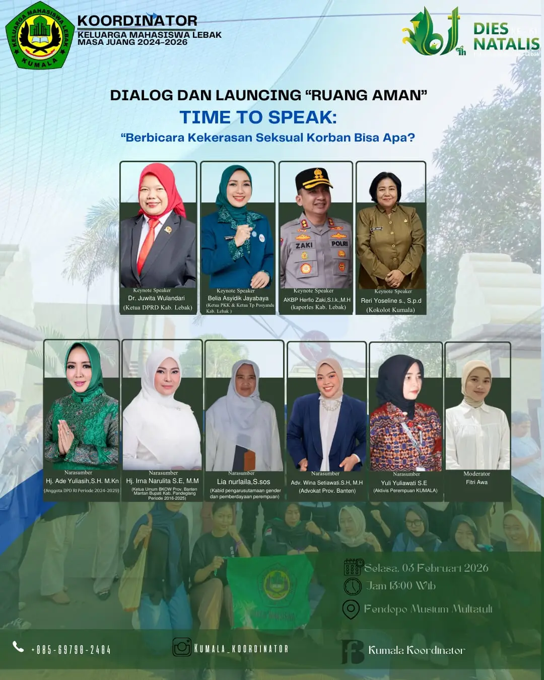Acara ini akan diselenggarakan pada Selasa, 3 Februari 2026, pukul 13.00 WIB, bertempat di Pendopo Multatuli, Kabupaten Lebak. Kegiatan tersebut menjadi bagian dari rangkaian peringatan Dies Natalis KUMALA ke 61 th sekaligus ruang edukasi publik mengenai isu kekerasan seksual yang masih marak terjadi.