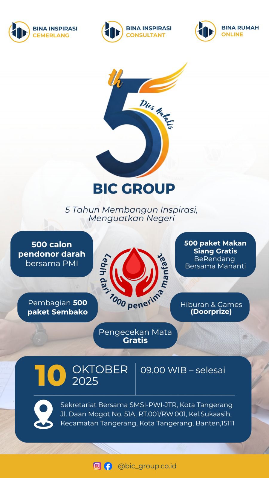 Sinargunung.com, Kota Tangerang | Dalam rangka memperingati ulang tahun ke-5, Bina Inspirasi Cemerlang (BIC) Group akan menggelar kegiatan sosial bertajuk “Membangun Inspirasi, Menguatkan Negeri” pada Jumat, 10 Oktober 2025, di Sekretariat Bersama (Sekber) PWI, SMSI Kota Tangerang, dan JTR, Jalan Daan Mogot No. 51, Kelurahan Sukaasih, Kecamatan Tangerang.