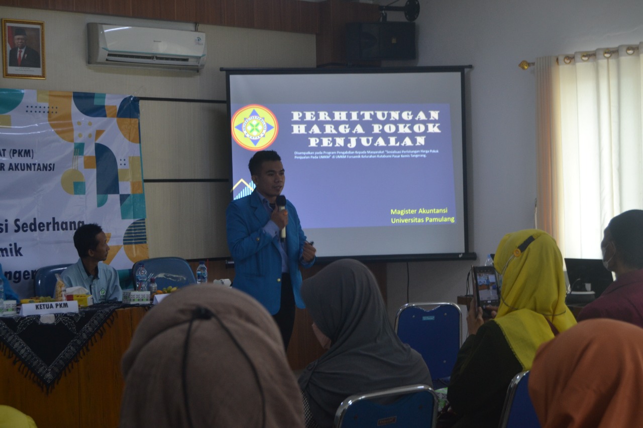 Untuk diketahui, bertindak sebagai ketua Panitia Pelaksana PMKM Marnija, S.E., S.H., M.M., M.H. yang biasa disapa dengan Jaja, yang mempersiapkan beberapa rekannya bertindak sebagai narasumber yang nota bene mahasiswa/wi Prodi Magister Akuntansi UNPAM dipersiapkan dari para praktisi professional antara lain Muhammad Arbai, Luh Gede Arieska, David Parningotan Gultom , dan one berkat harapan gulo yang juga berprofesi sebagai konsultan pajak menyampaikan materi serta Arbai yang pernah menjabat sebagi Komisaris di sebuah perusahaan swasta dan sekarang menjadi Konsultan Pajak menyampaikan materi mengenai Pajak untuk UMKM. Arieska yang sehari-hari menjadi Pimpinan Bagian keuangan perusahaan perhotelan mengajarkan penggunaan Aplikasi Akuntansi UMKM. Sedangkan David Parningotsn Gultom dan One Berkat Harapan Gulo menyampaikan pemaparan materi perhitungan HPP dan Laporan Keuangan. Acara menjadi menarik dan seru karena disela-sela acara diselingi dengan Ice Breaking, Funs Game dan pembagian doorprize bagi peserta yang dapat menjawab pertanyaan narasumber. Ben/One