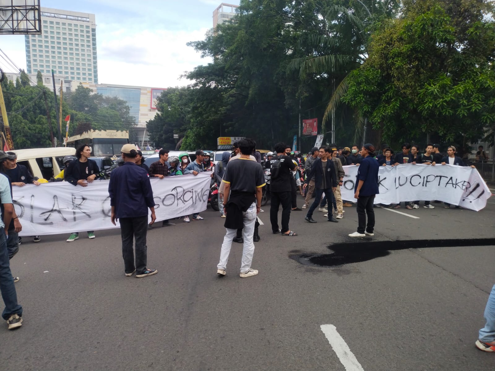 Diketahui dalam berjalannya aksi, mahasiswa membakar ban di tengah jalan sebagai bentuk kekecewaan kami terhadap UU cipta kerja yang berujung dengan kemacetan yang panjang. Nur