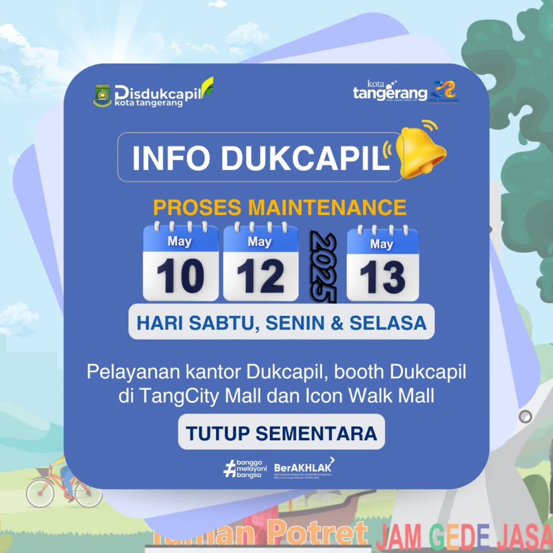 sinargunung.com, Kota Tangerang | Dalam rangka meningkatkan pelayanan administrasi kependudukan, Dinas Kependudukan dan Pencatatan Sipil (Disdukcapil) Kota Tangerang akan melakukan proses pemeliharaan sistem (maintenance) secara menyeluruh. Untuk itu, seluruh layanan offline Dukcapil Kota Tangerang akan ditutup sementara pada 10 hingga 13 Mei 2025 mendatang.