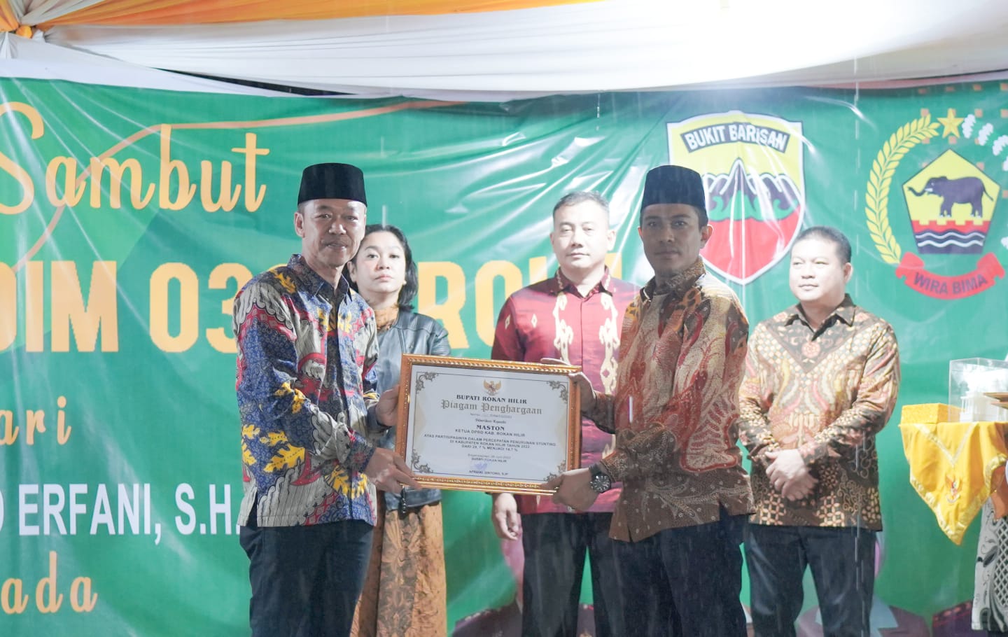 Bupati juga memberikan piagam penghargaan kepada Dandim 0321 Rohil Letkol Inf M Erfani atas partisipasi nya dalam membangun Kabupaten Rohil. Bustomi
