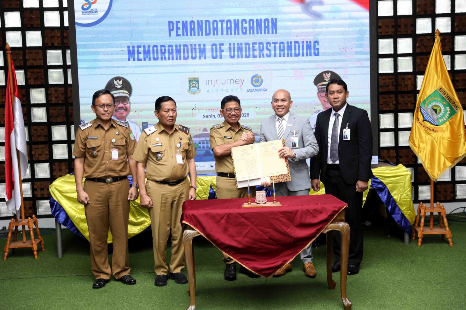 Penandatanganan berlangsung di Ruang Patio, Pusat Pemerintahan Kota Tangerang, Senin (2/3/2026), bersama jajaran direksi PT Angkasa Pura Indonesia (API) dan PT Jasa Marga (Persero) Tbk beserta anak perusahaannya.