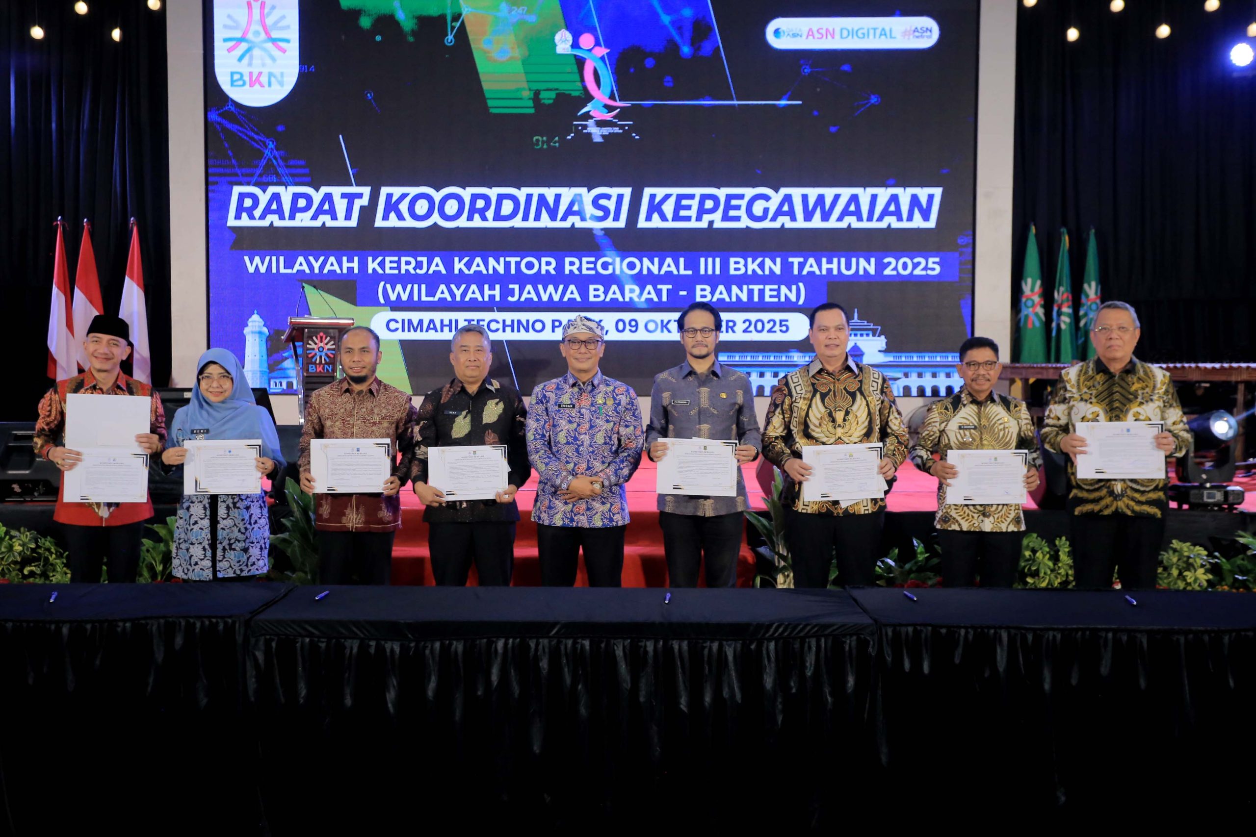 sinargunung.com, Kota Tangerang | Pemerintah Kota (Pemkot) Tangerang kembali menorehkan prestasi membanggakan di bidang kepegawaian. Pada Rapat Koordinasi (Rakor) Kepegawaian Wilayah Kerja Kantor Regional III BKN Tahun 2025 yang digelar di Cimahi Techno Park, Jawa Barat, Kamis (9/10/2025), Pemkot Tangerang berhasil meraih empat penghargaan dari Badan Kepegawaian Negara (BKN).