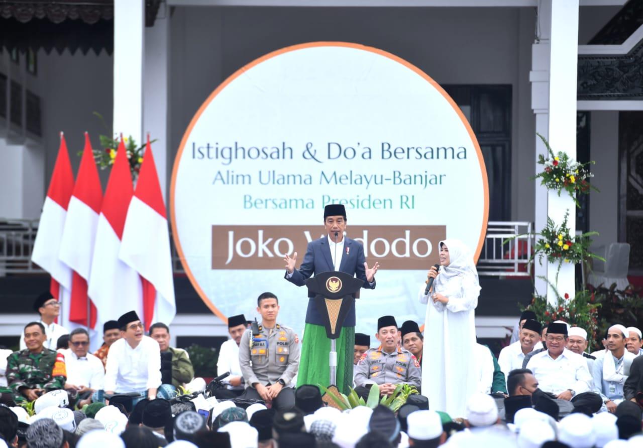 “Juga memohon rida Allah SWT agar selalu membimbing dan memudahkan langkah-langkah kita, dan kepada para alim ulama, tuan-tuan guru, dan para mualim, para kyai, serta segenap masyarakat Melayu-Banjar mohon didoakan bangsa ini,” ucap Presiden.