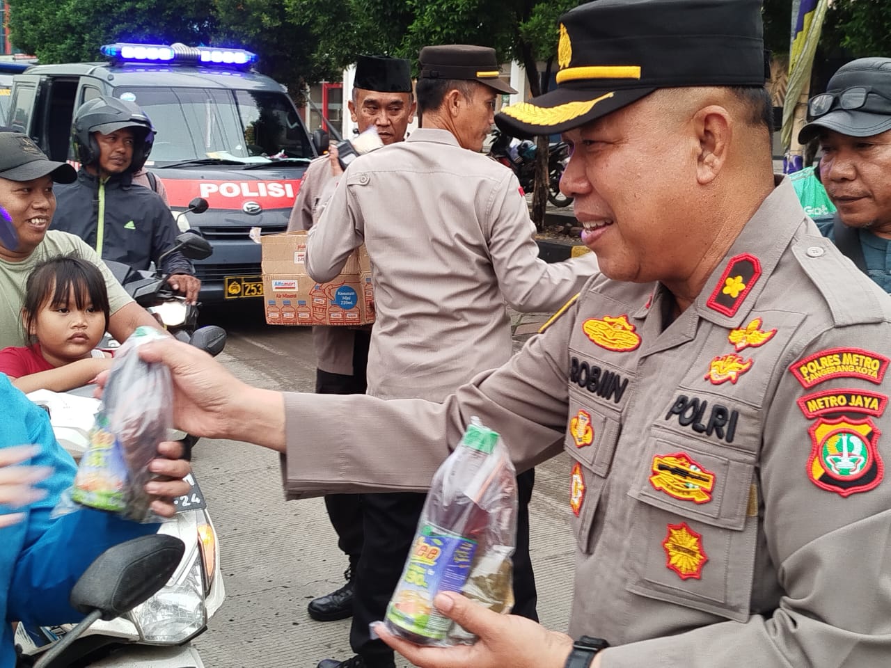 Kapolsek Jatiuwung Kompol Rabi’in didampingi Waka Polsek AKP Fahyani, dan Kanit Binmas AKP Agus Nurdin mengatakan, ‘ Dalam kegiatan berbagi takjil berbuka puasa ini dilaksanakan oleh jajaran personel Bhabinkamtibmas dilokasi Jalan Gatot Subroto, Kelurahan Keroncong, Kecamatan Jatiuwung Kota Tangerang.