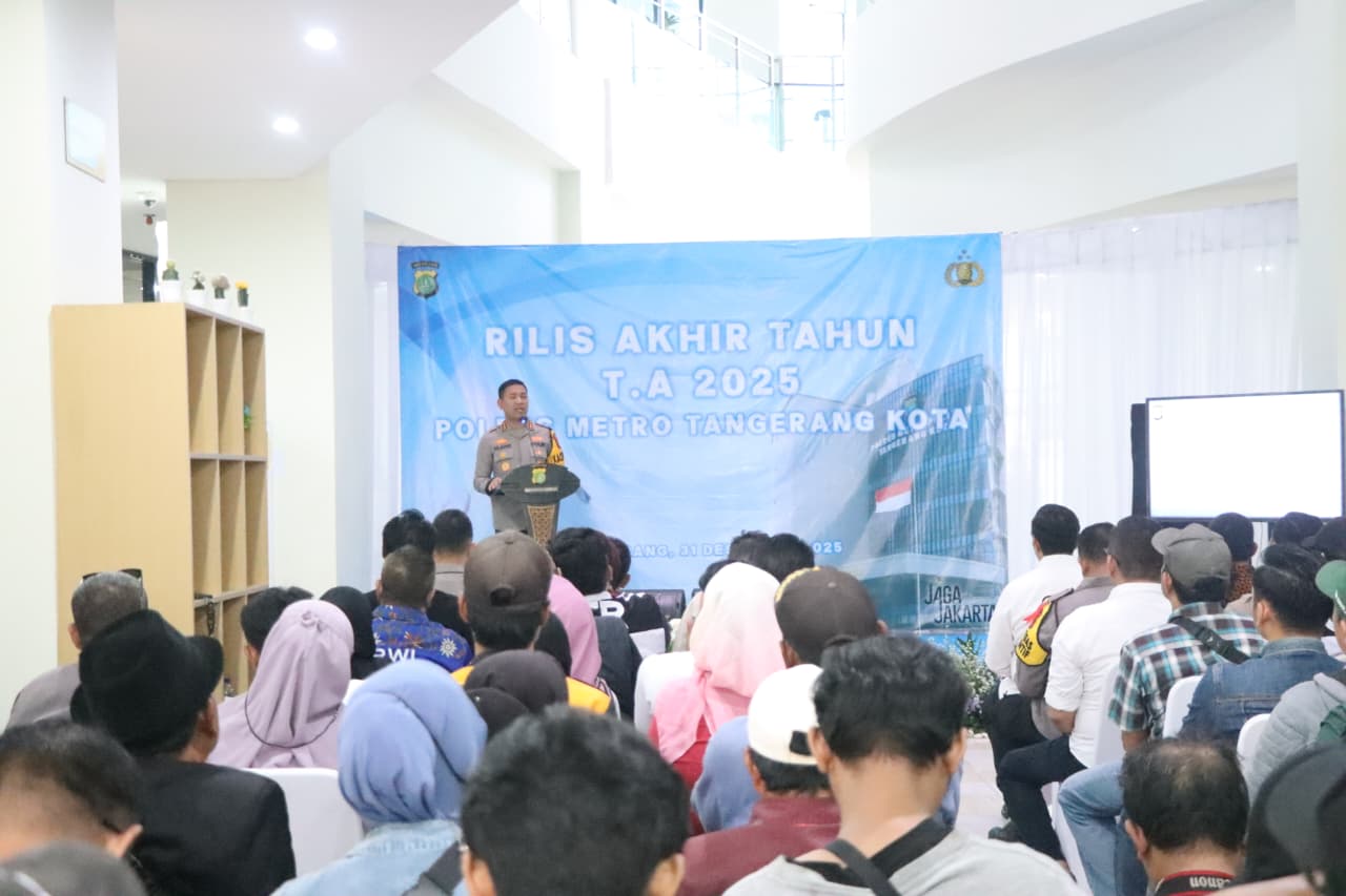 Rilis akhir tahun dipimpin langsung Kapolres Metro Tangerang Kota Kombes Pol. Dr. Raden Muhammad Jauhari, S.H., S.I.K., M.Si. Acara tersebut turut dihadiri Wali Kota Tangerang Drs. H. Sachrudin, Wakil Wali Kota Tangerang H. Maryono Hasan, A.P., M.Si., Ketua DPRD Kota Tangerang H. Rusdi Alam, S.Th.I., M.S.M., Kepala Pelaksana BPBD Kota Tangerang H. Mahdiar, S.STP., M.Si., jajaran pejabat utama Polres, serta insan media.