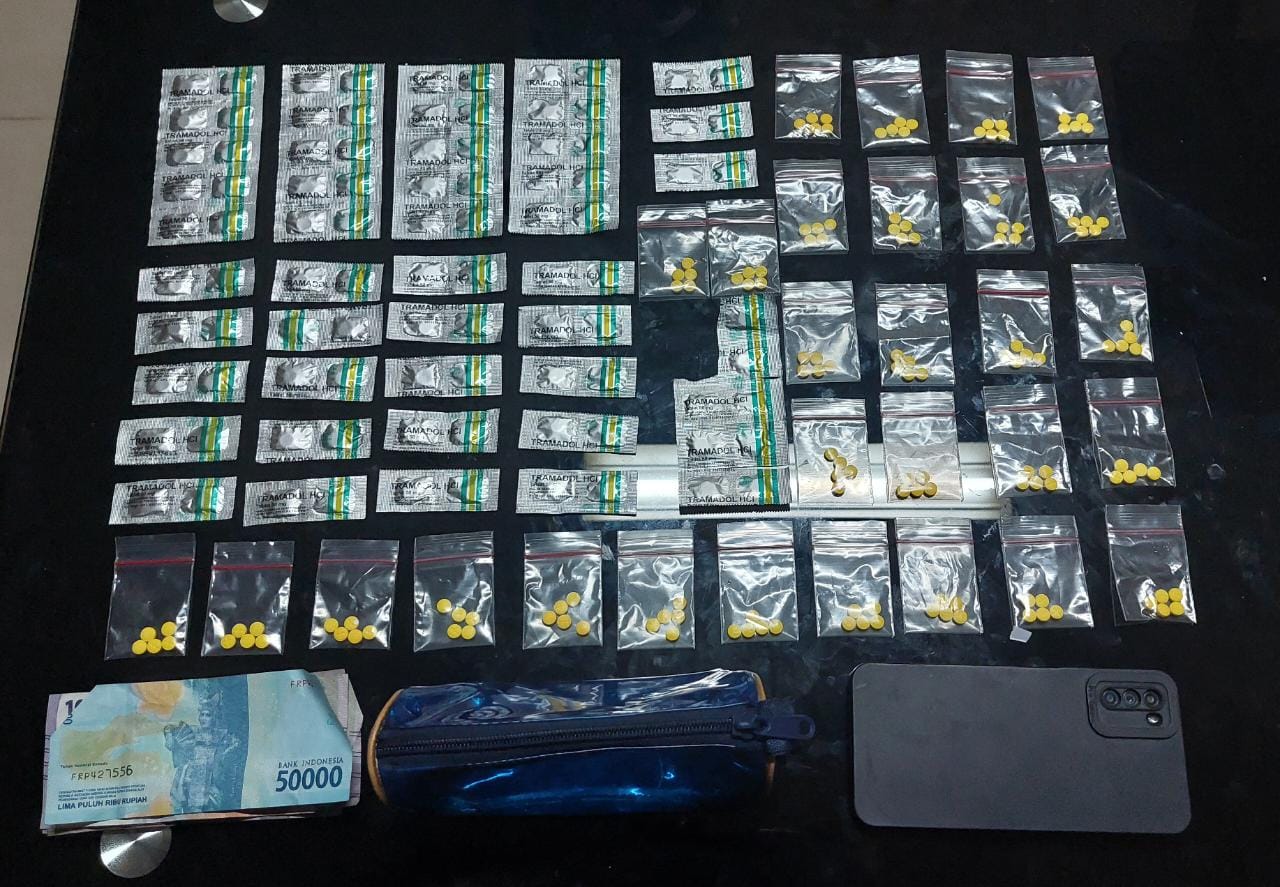 Dalam hal ini Malik mengatakan pihaknya berhasil mengamankan beberapa barang bukti. “Dari Pelaku, petugas berhasil mengamankan satu buah tas kecil warna biru, 94 butir obat jenis Tramadol HCI, 145 butir obat jenis Heximer, uang tunai hasil penjualan sebesar Rp100.000 dan satu unit handphone merk POCO warna hitam,” lanjut Malik.