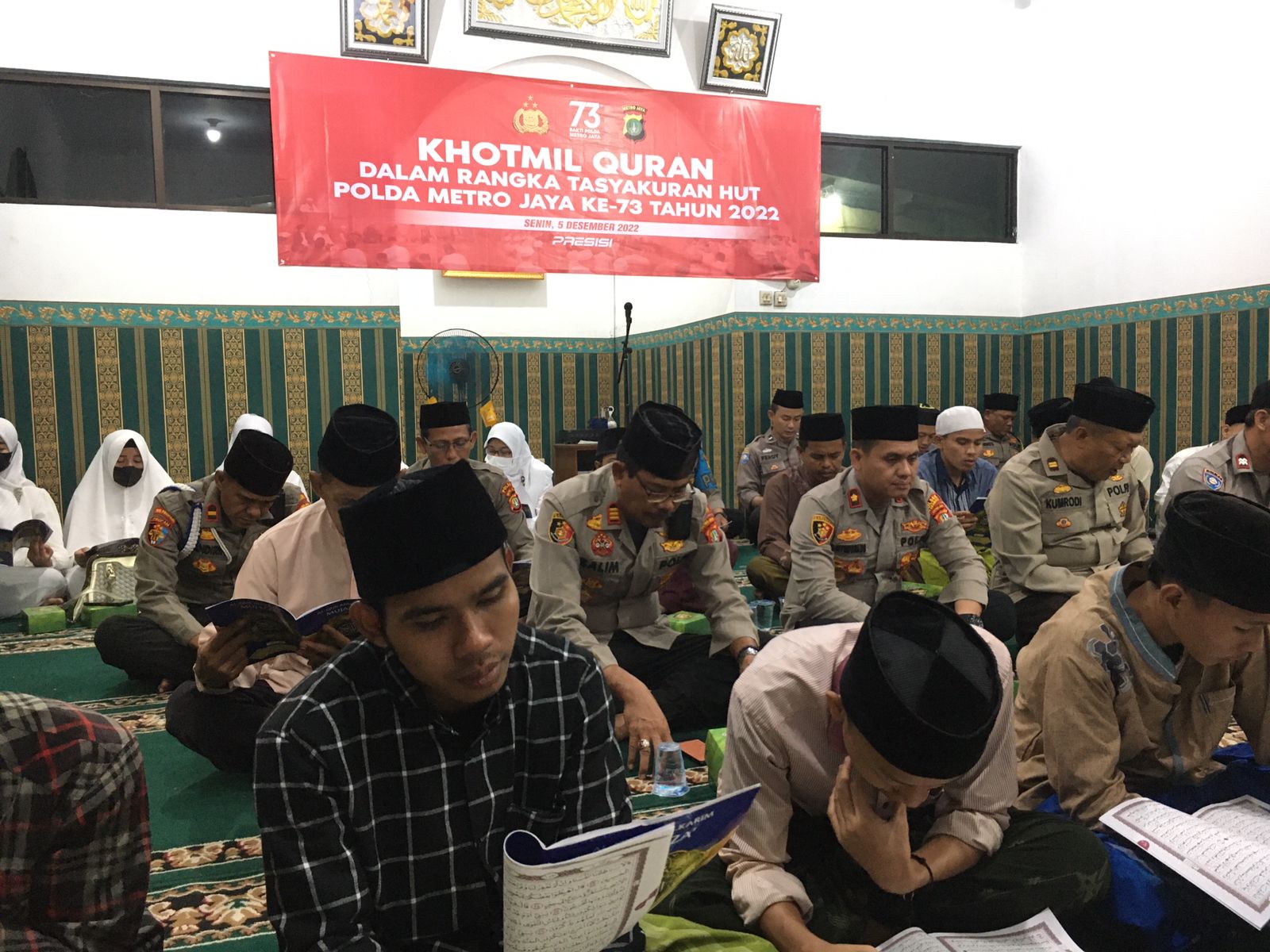 SINARGUNUNG.COM, KOTA TANGERANG | Dalam rangka tasyakuran peringatan Hari Ulang Tahun (HUT) Polda Metro Jaya (PMJ) yang ke-73 tahun, Polsek Karawaci menggelar Khotmil Quran secara serentak bersama santri dan anak yatim-piatu, di Musholla At’taqwa Kelurahan Cimone Kecamatan Karawaci Kota Tangerang, Senin (5/12/2022) malam.