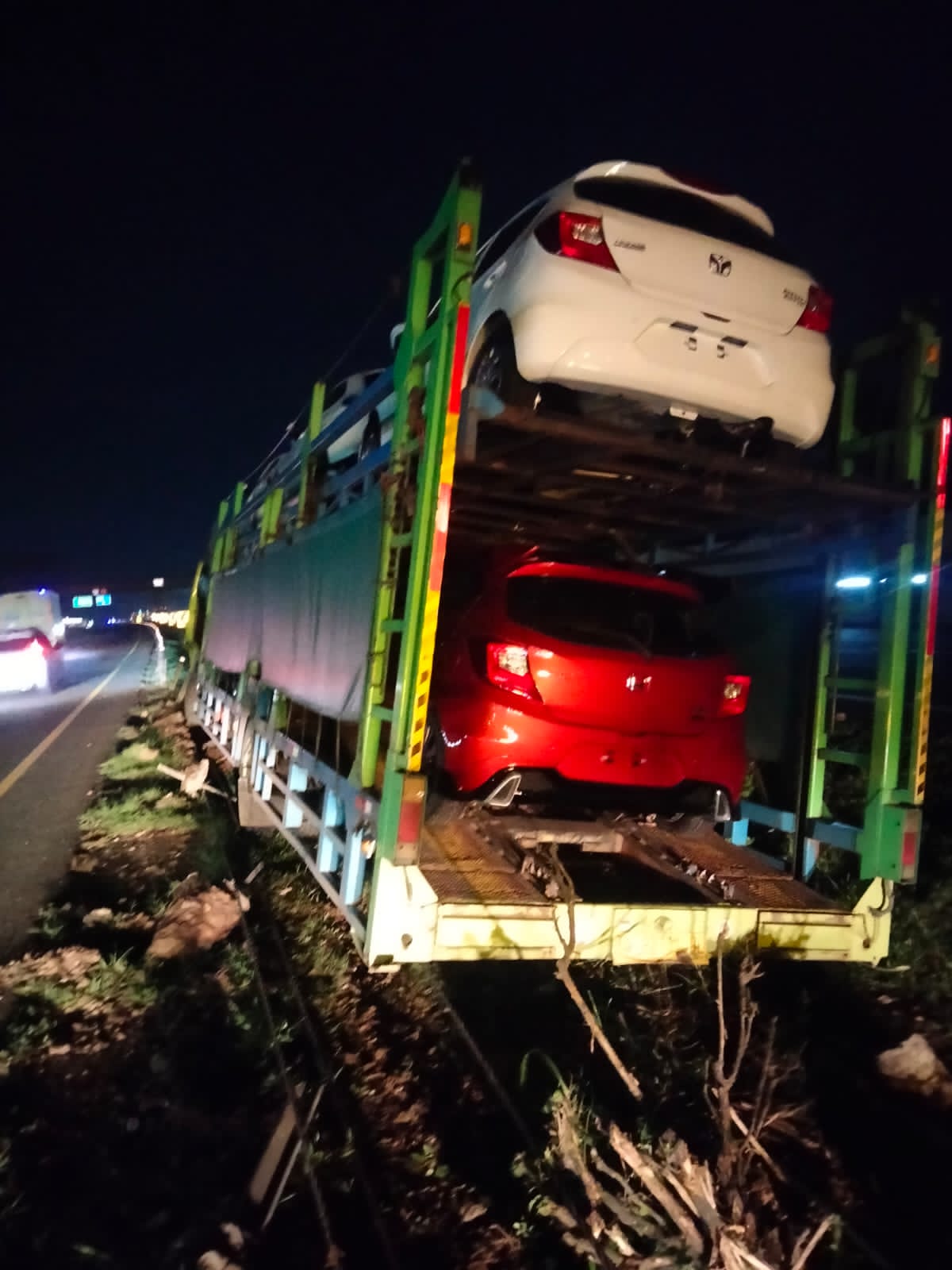 Kecelakaan lalu lintas ini melibatkan satu kendaraan yaitu Truck Fuso Nopol T-9211-DL yang mengangkut mobil baru.