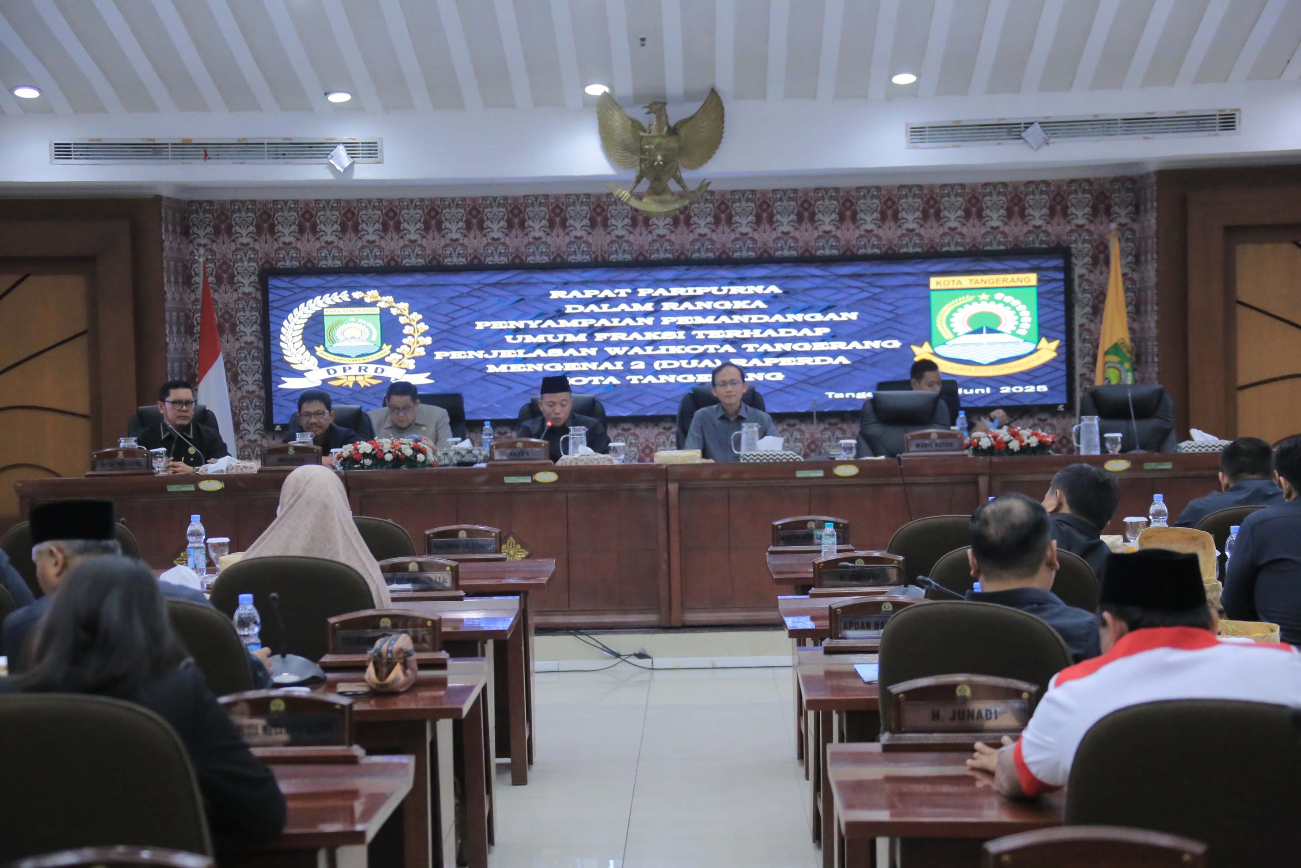 sinargunung.com, Kota Tangerang | Dalam rangkaian proses legislasi dua Raperda Kota Tangerang, Wali Kota H. Sachrudin bersama Wakil Wali Kota H. Maryoni Hasan menghadiri Rapat Paripurna Dewan Perwakilan Rakyat Daerah (DPRD) untuk menyampaikan jawaban atas Pandangan Umum yang disampaikan oleh fraksi-fraksi.